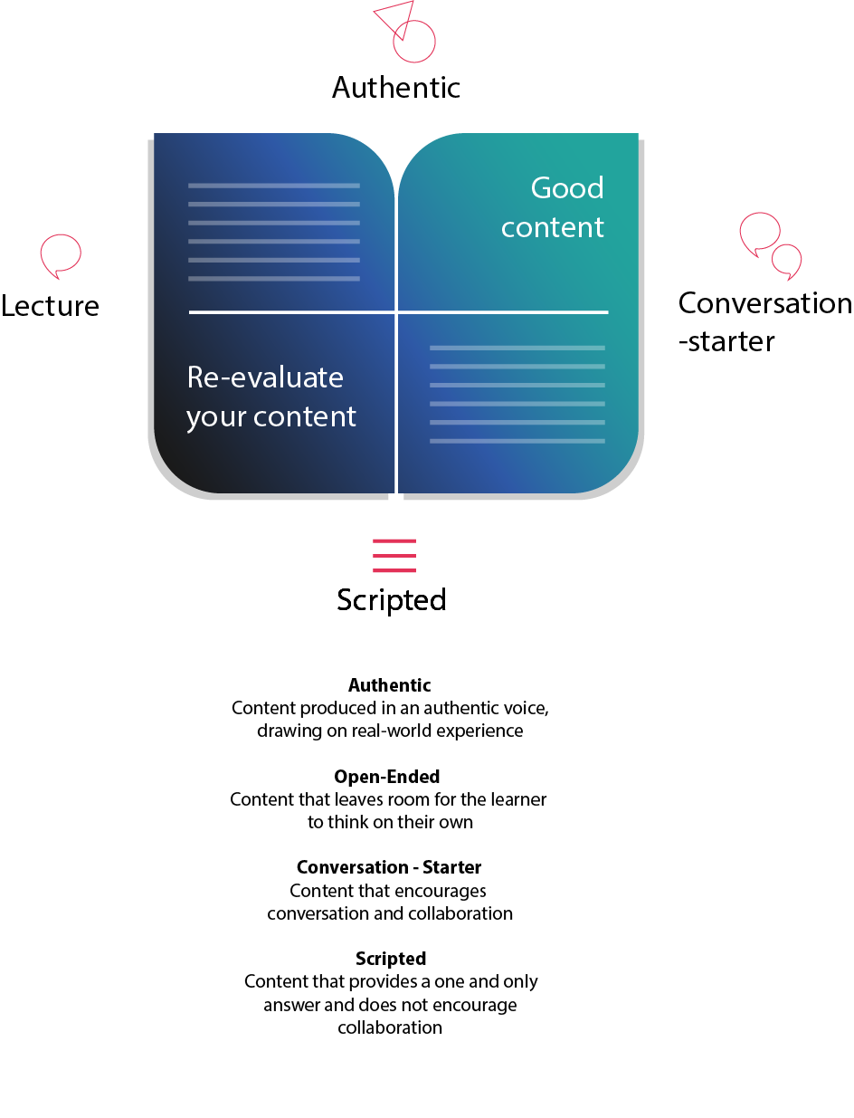 From our experience learners are more open to converse, respond, and take risks when the content in a learning program is written or produced in an authentic voice, drawing on real-world experience. Good collaborative learning content is also more open-ended and leaves room for the learner to think on their own. Scripted lectures telling learners exactly what the one-and-only answer is don’t drive interesting conversation.